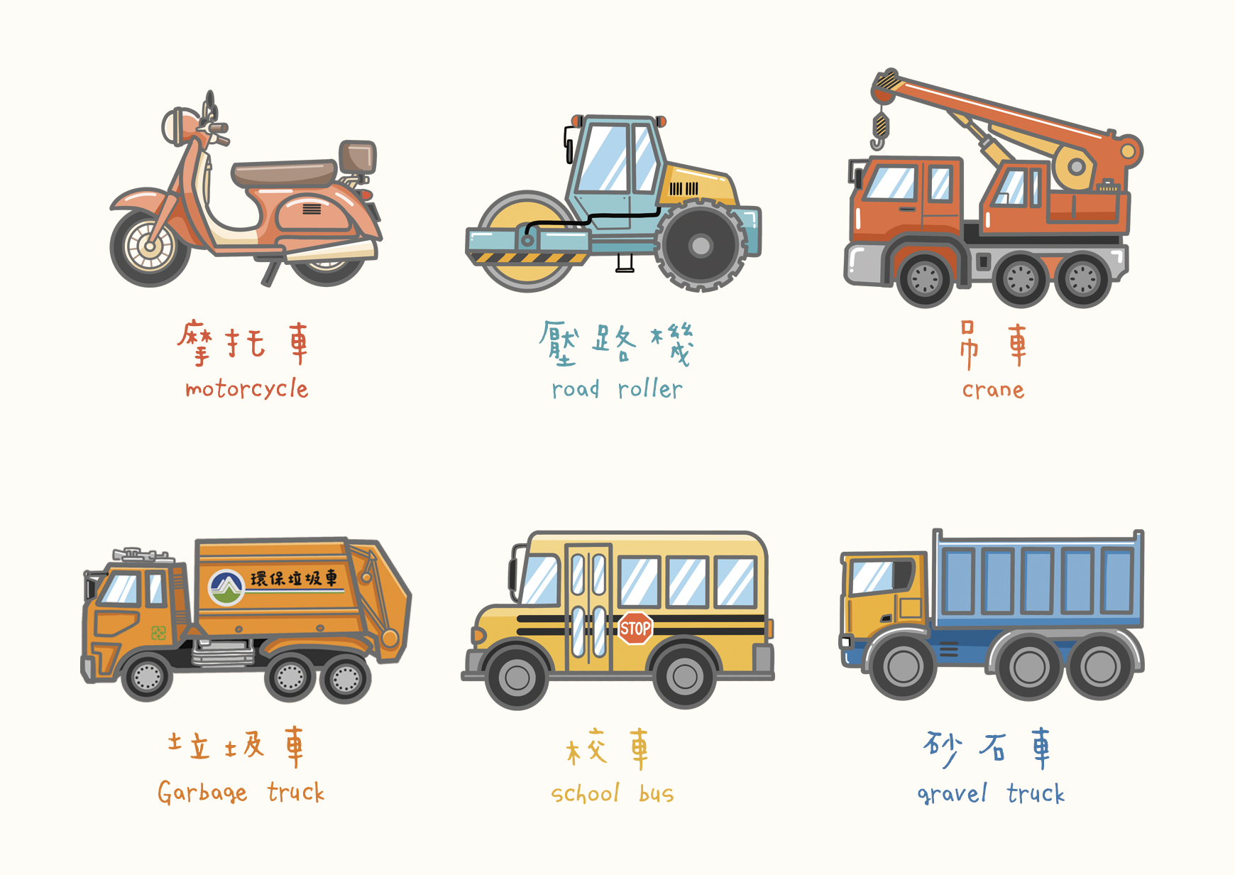 吊車、砂石車、垃圾車、摩托車、校車、壓路機 (陸續新增中)