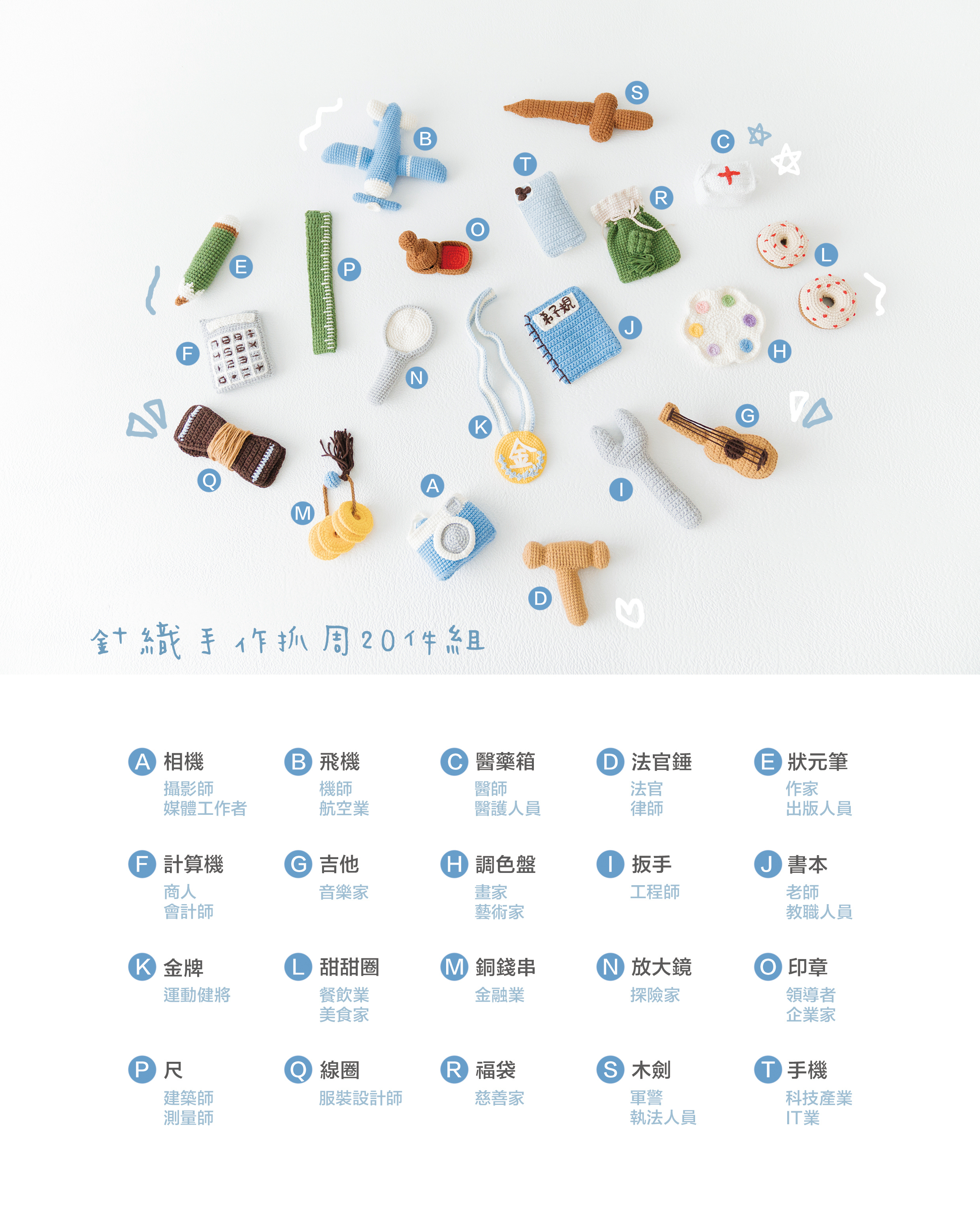 藍綠款-相機、飛機、醫藥箱、法官錘、狀元筆、計算機、吉他、調色盤、扳手、書本、金牌、甜甜圈、銅錢串、放大鏡、印章、尺、線圈、福袋、木劍、手機