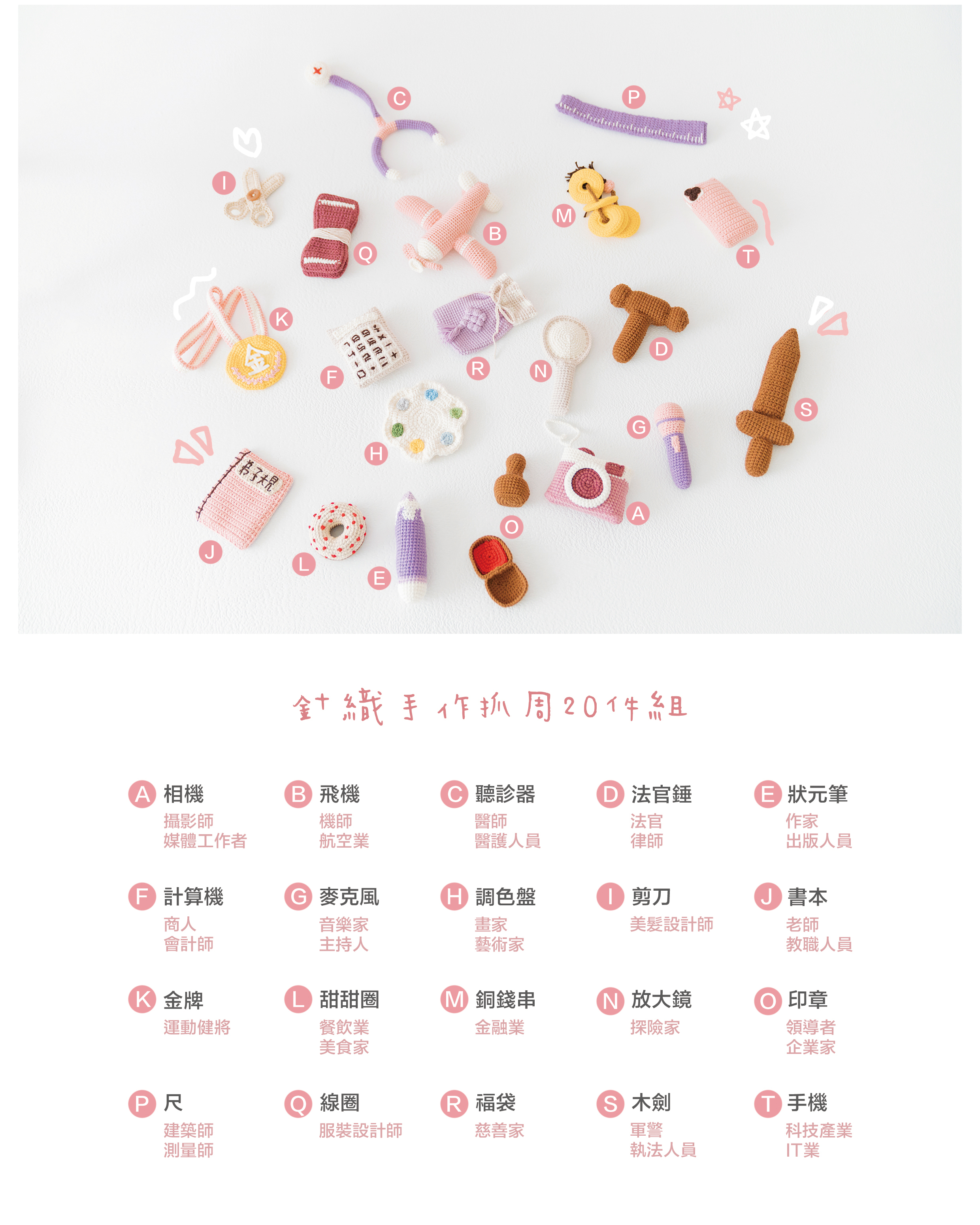 粉紫款--相機、飛機、聽診器、法官錘、狀元筆、計算機、麥克風、調色盤、剪刀、書本、金牌、甜甜圈、銅錢串、放大鏡、印章、尺、線圈、福袋、木劍、手機