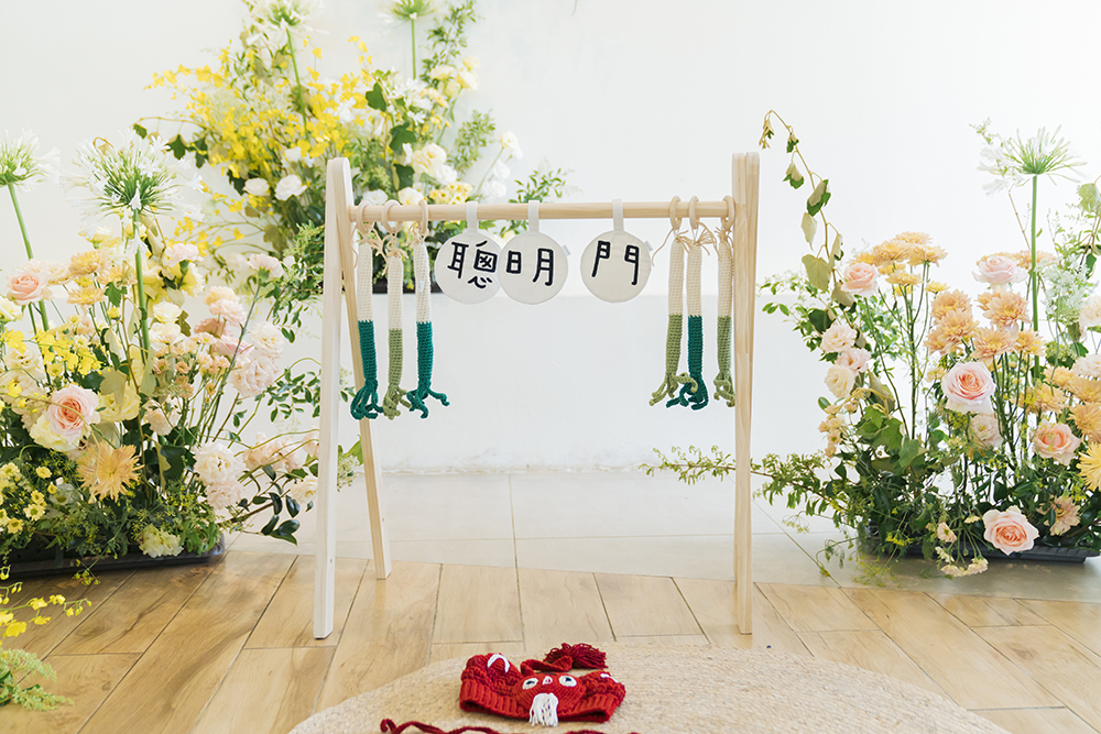 訂製的聰明門木架高度,周歲孩子可輕易伸手抓取到針織蔥玩具,