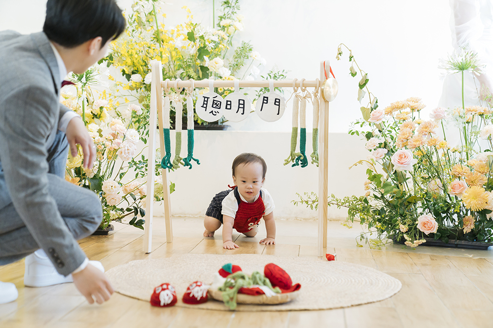 傳統的抓周古禮,最經典的就是孩子自己穿過聰明門,得到智慧。